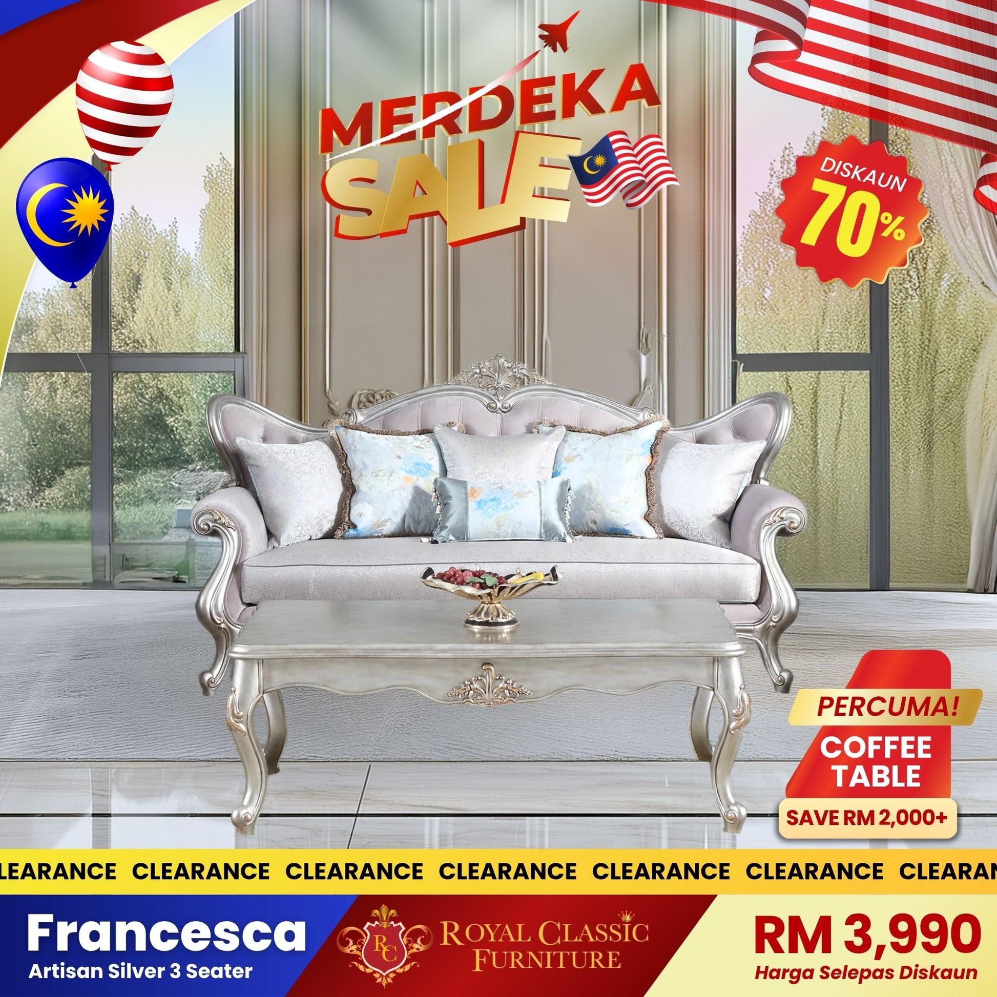 Sofa 3-Seater FRANCESCA ialah ciptaan artisan, dibalut dengan baldu dengan kemasan perak berkabus dan sedikit warna ungu muda yang paling halus. Bingkai melengkung perak yang diukir meningkatkan bentuk yang anggun, manakala bantal aksen yang direka dengan teliti membawa keseimbangan dan minat visual.